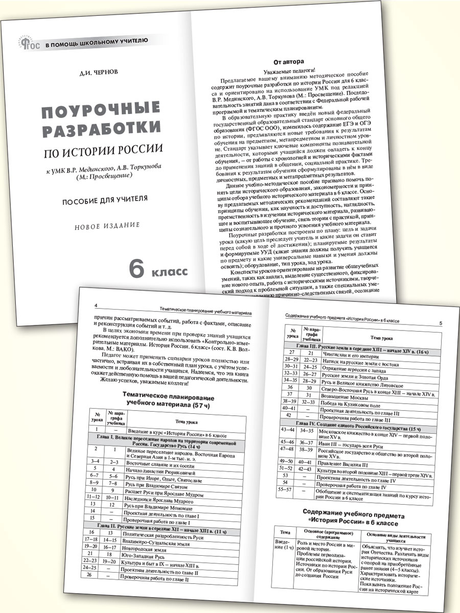 В пособии представлены поурочные разработки к учебнику по истории России для 6 класса под редакцией В.Р. Мединского, А.В. Торкунова (М.: Просвещение), который входит в действующий федеральный перечень учебников (приказ Минпросвещения России от 26.06.2025 № 495). Материал соответствует требованиям действующих ФГОС и ФОП ООО.