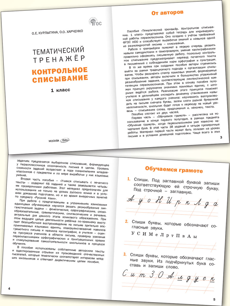 Пособие разработано в соответствии с требованиями ФГОС НОО и предназначено для обучения учащихся 1 класса безошибочному воспроизведению на письме сначала букв, затем слогов, а далее списыванию слов и текста. При списывании учащиеся будут решать учебные орфографические, грамматические и другие задачи, актуальные для конкретного этапа начального языкового образования.