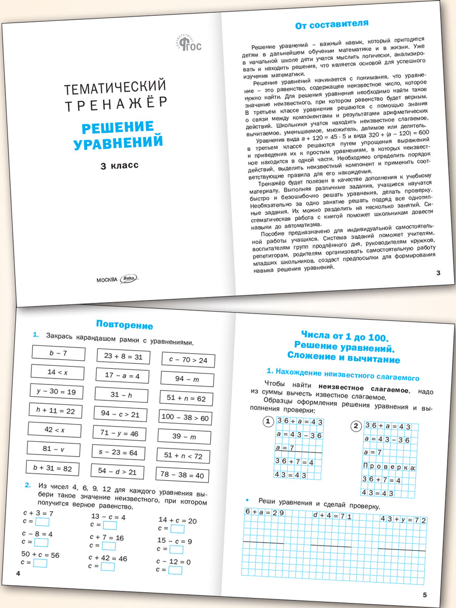 Тренажёр продолжает серию пособий, помогающих сформировать устойчивый навык решения уравнений учениками начальной школы. Усвоение этой трудной для младшей школы темы пригодится детям не только в средней школе, но и в жизни. Материал методически выстроен, соответствует возрастному уровню и школьной программе. В третьем классе кроме разнообразных простых уравнений рассмотрены несколько видов усложнённых.