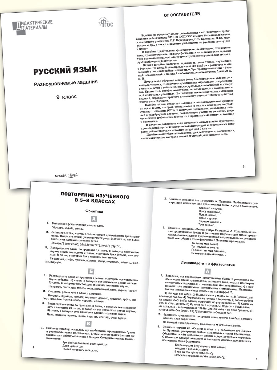 Пособие представляет собой универсальный сборник разноуровневых заданий для проведения самостоятельных проверочных работ по русскому языку в 9 классе. Задания разделены на три уровня сложности. Пособие составлено в соответствии с требованиями действующих ФГОС и ФОП ООО и может использоваться при работе с учебником С.Г. Бархударова, С.Е. Крючкова, Л.Ю. Максимова и др., а также с другими учебниками. Пособие включает итоговый тест в формате ОГЭ. Приведены критерии оценивания выполнения заданий с развёрнутым ответом, это позволит ученикам подготовиться к написанию изложения и сочинения.